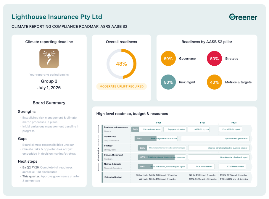 To get your own complimentary, AASB S2 roadmap to compliance, timeline and budget, check out our Readiness assessment tool. It takes less than 5 mins and you receive an editable, board-ready pack.
