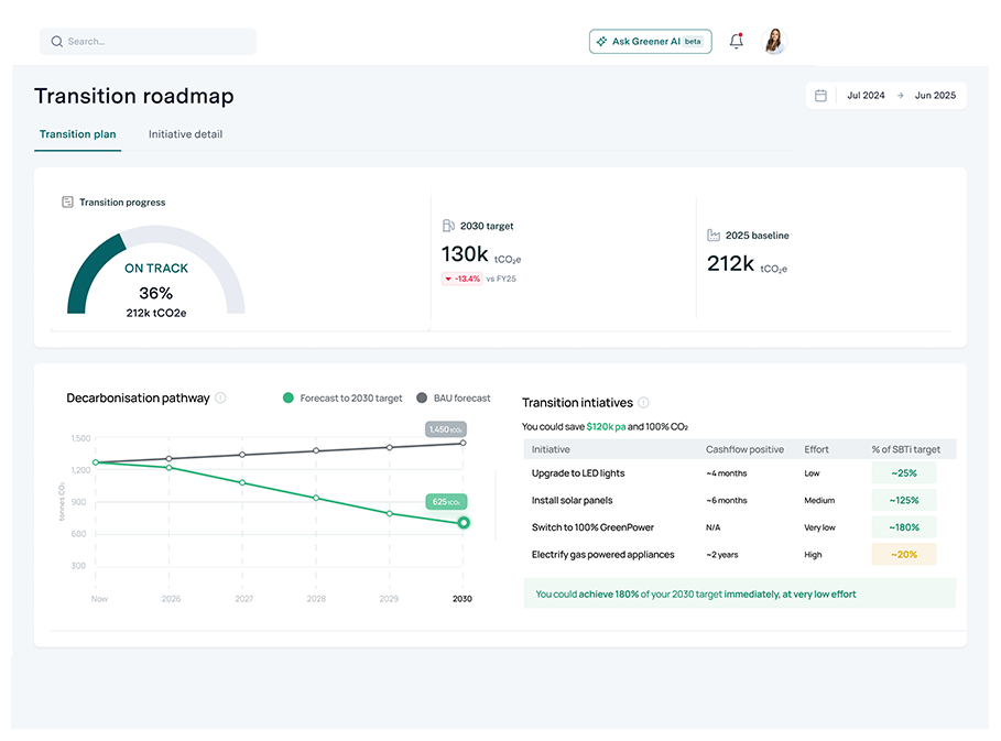 With Greener: Our auto-classification tools and specialised datasets generate credible Scope 1, 2, and 3 baselines quickly, with a clear plan to improve year on year. You don’t need to be an expert - the expertise is baked into the platform.