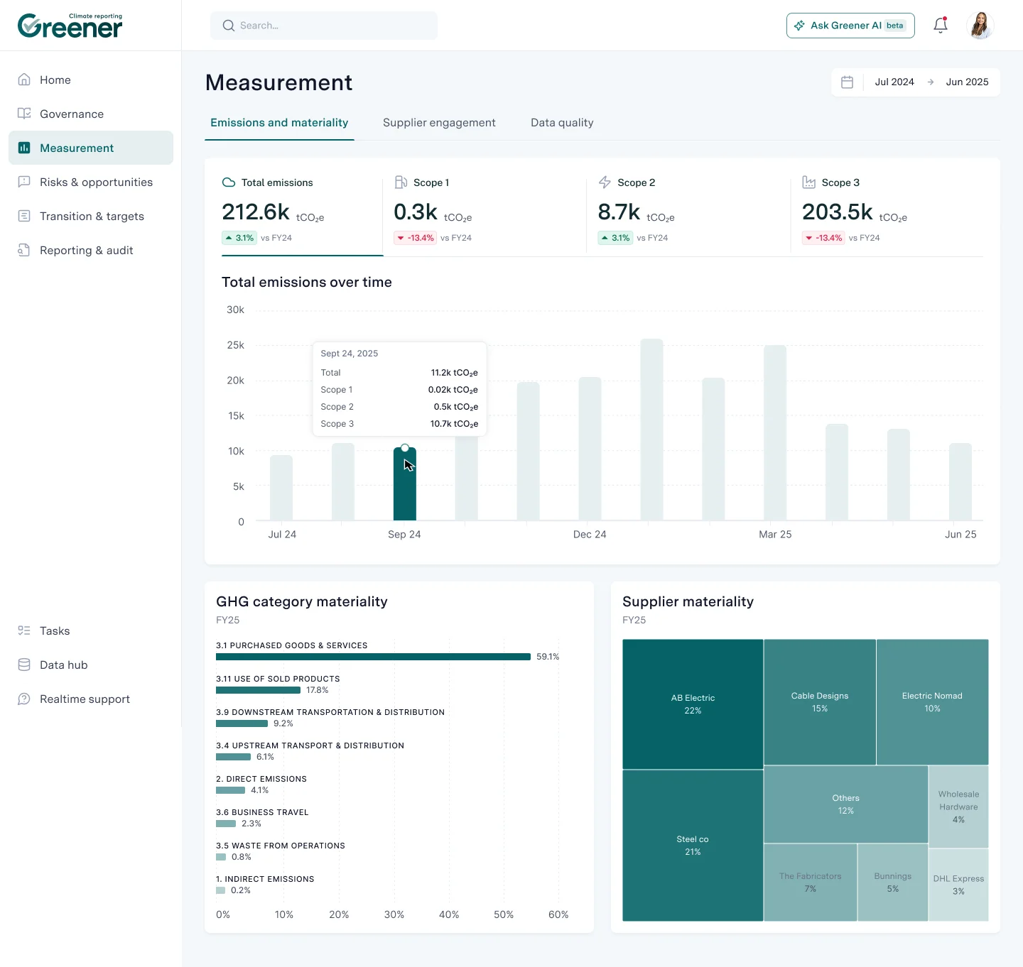 Greener’s software automates Scope 1, 2, 3 emissions reporting, helping your business track and report emissions across your operations and value chain. The platform uses AI-powered tools to collect and analyse data in real-time, ensuring your reports are accurate, up-to-date, and aligned with global emissions reporting standards.